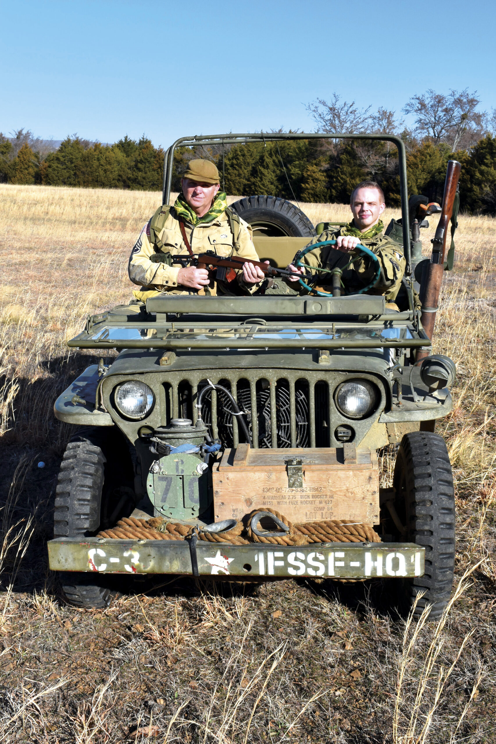 Fisher also belongs to McAlester’s VFW Post 1098, where he participates in the Honor Guard and volunteers during bingo nights. Father and son participated in 2025’s Veterans Day parade in Hartshorne, Oklahoma, driving the WWII jeep and displayed military uniforms and gear in the town’s old Armory.