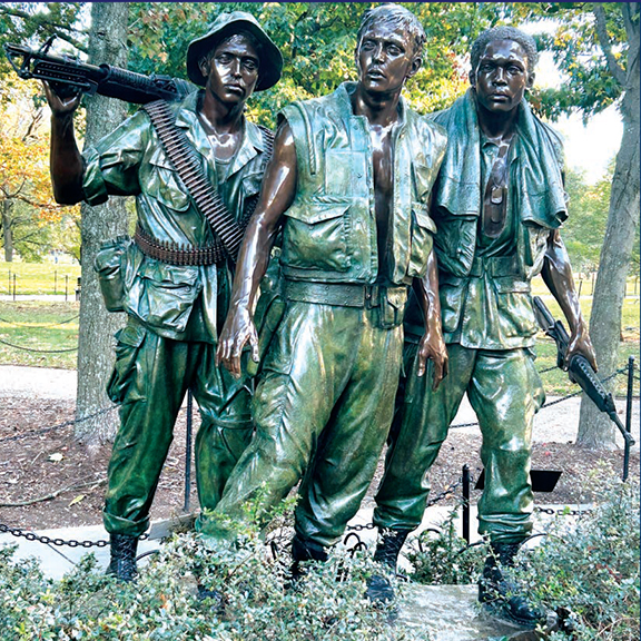 Nearby is the Three Servicemen Statue by Frederick Hart, dedicated in 1984, depicting young, alert, weapon-carrying Vietnam soldiers. Hart said, “The contrast between the innocence of their youth and the weapons of war underscores the poignancy of their sacrifice…Their strength and their vulnerability are both evident.”