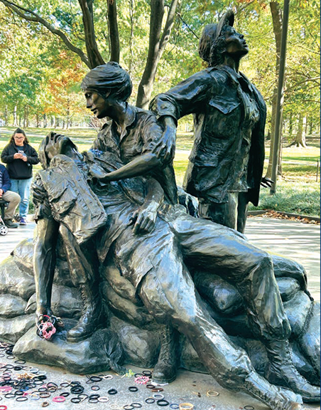 Nearby, the Vietnam Women’s Memorial from 1993, sculpted by Glenna Goodacre, honors women who served in Vietnam. The statue shows three nurses caring for a wounded soldier, reflecting the critical roles women played. Eight servicewomen died in Vietnam, and their names are inscribed on The Wall.