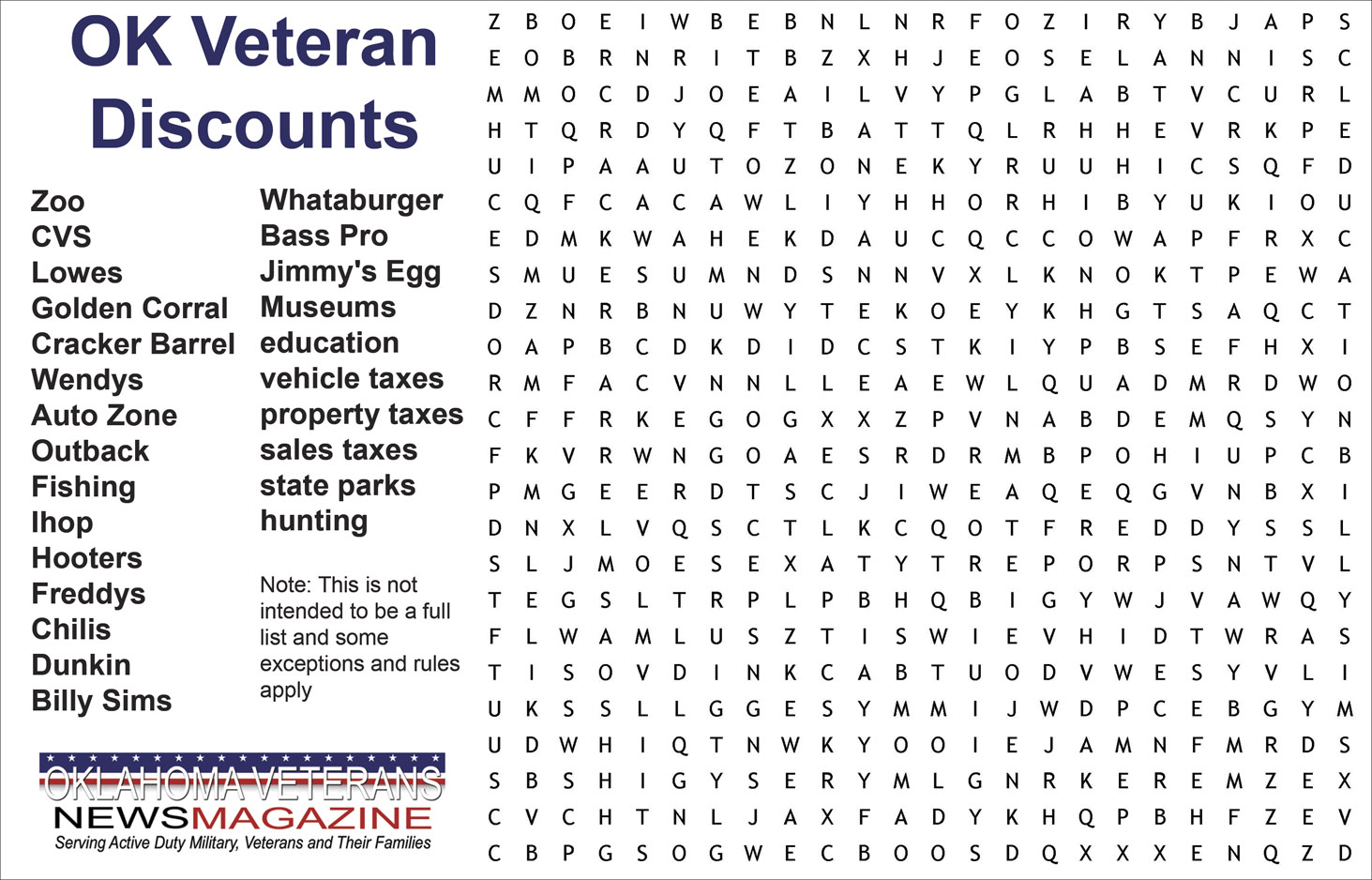 Home 10/01/25 Word Search – Military Discounts 10/01/25CLICK HERE FOR MORE SN&L NEWS THIS MONTH Word Search – Military Discounts By Steve Eldridge - Oct 2, 2025 28 0 FacebookTwitterPinterestWhatsApp RELATED ARTICLESMORE FROM AUTHOR Vets’ Fantastic, Free Roadside Attraction Oklahoma Vet Keeps On Serving Service, Loyalty, Honor, Faith and Compassion America’s Last Six MiG Air Ace Loudermilk Touts Second Half Life Reinvention in Book A Life of Courage and Compassion: Remembering Second Lieutenant Geraldine Crouch Social0FansLike0FollowersFollow0SubscribersSubscribe
