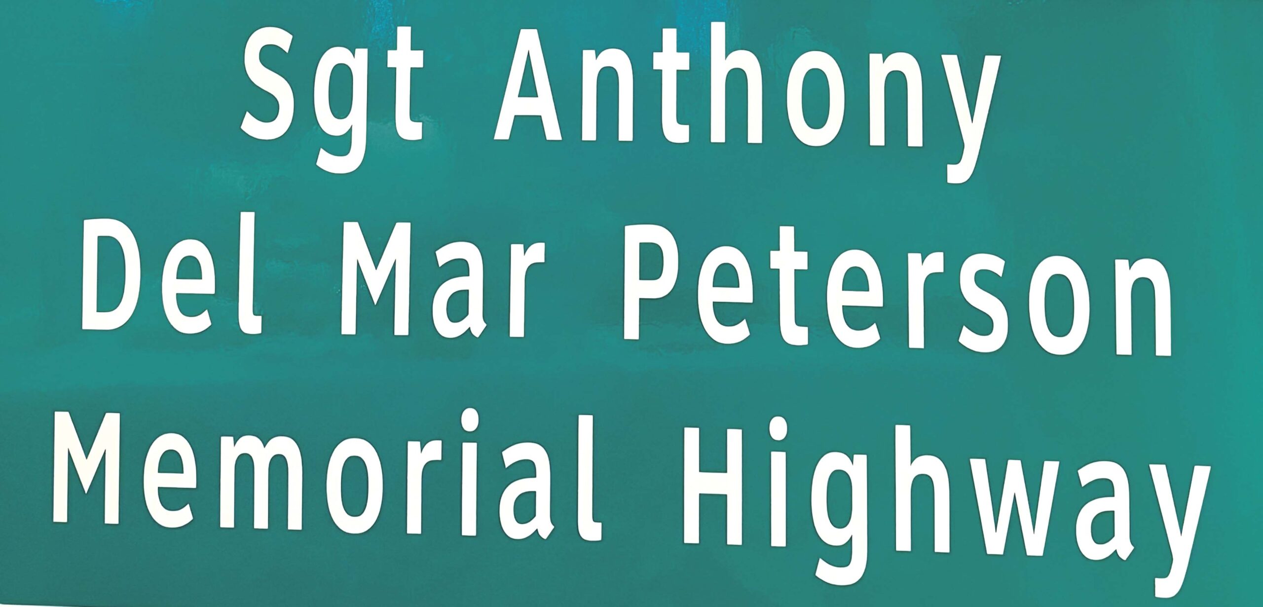 Have you seen those memorial highway signs with names and military ranks on them along the interstates in the Tulsa area? Have you wondered about the person named on those signs? One such sign is on Interstate 169 at 76th and 86th Streets in the north and southbound lanes in Owasso. It says “SGT Anthony Del Mar Peterson Memorial Highway.” Who is SGT Anthony Del Mar Peterson and why does he have a sign? I will start at the end of the story and then go back to the beginning.