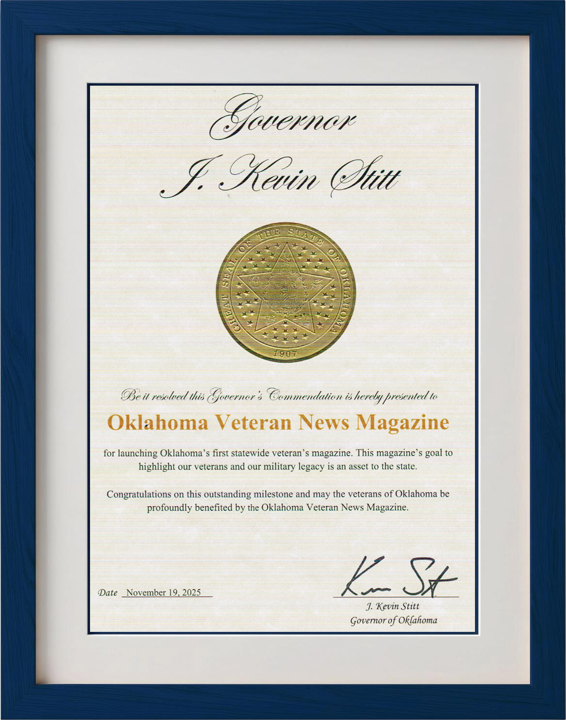 Oklahoma’s first statewide veteran news magazine, now in its eighth month, has received an official commendation from Governor Kevin Stitt for its outstanding service and contributions to the state’s military community. The honor recognizes the magazine’s rapid growth and its commitment to sharing stories and resources vital to Oklahoma’s more than 300,000 veterans and their families.